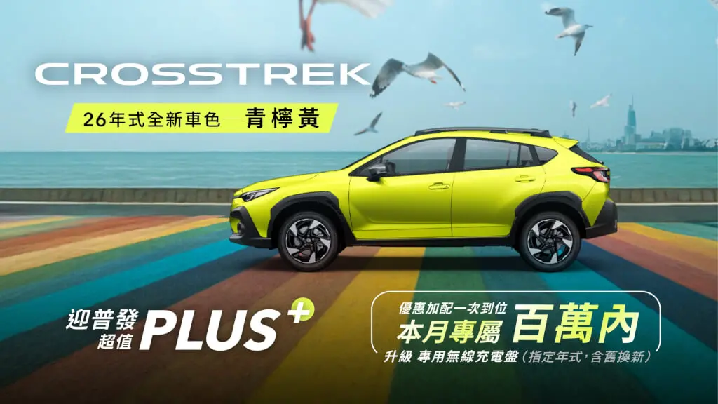 連續多年蟬聯JNCAP五星大賞的跨界潮旅Crosstrek,其安全科技配備更是傲視同級對手,不僅是同級唯一搭載SAWD對稱式全時四輪驅動系統、BOXER水平對臥引擎、SGP全球模組化底盤,以及標配三鏡頭的進階版EyeSight 4.0智能駕駛安全輔助系統(*註)等四大核心科技的CUV車款,靈活駕馭好開易上手的特性,絕對是創造精彩生活的首選車款!跨界潮旅Crosstrek 針對26年式新車全面升級最先進的EDSS駕駛異常自動煞停系統,讓安全更上一層樓,另推出「青檸黃」、「沙丘金」新車色搶眼亮相,即刻開放預訂!凡於本月訂車即可再享「SANGEAN多功能戶外收音機」限量訂車禮;此外25年式Crosstrek指定車款本月超狂優惠價109.8萬起,搭配政府舊換新最高補助百萬內即可輕鬆入主,再享90萬50期0利率並升級專用無線充電,全車系均加贈原廠5年或12萬公里延長保固。