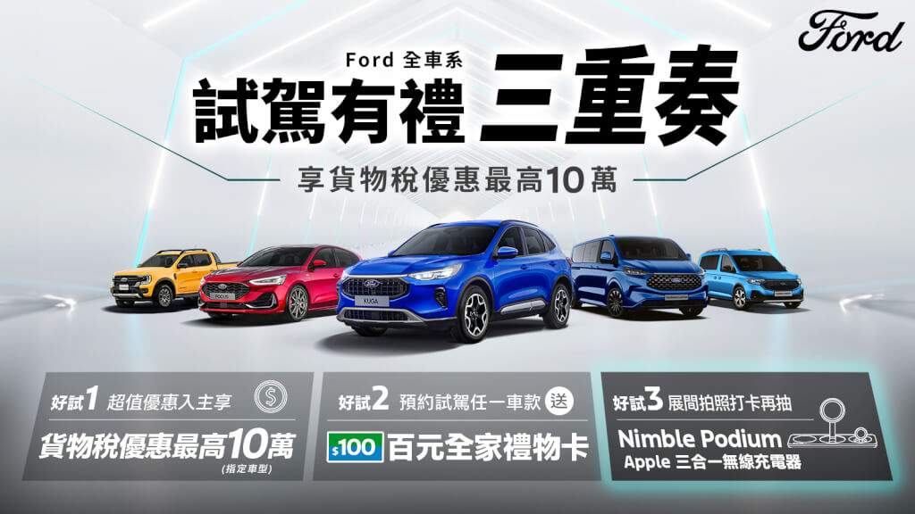 福特六和衝刺歲末購車買氣,推出多項熱門車款限時優惠,自2025年11月1日起至11月30日止,至全台Ford展示中心試駕任一車款,即可獲得全家百元禮物卡,於展示間拍照打卡上傳Ford(TW)官方臉書粉絲團指定貼文,就有機會獲得Apple配件之Nimble Podium三合一無線充電器〔註一〕。此外,福特六和積極響應政府減稅政策,期間入主The All-New Ford Kuga 1.5T享力挺價83.9萬起(含舊換新),方案包含5萬元力挺購車金〔註二〕、高額分期零利率及5年原廠保固〔註三〕,1.5T Active指定車型再加贈3萬元配件金;為感謝萬名車主入主,New Ford Ranger Wildtrak享限時感恩回饋價154.8萬(含舊換新),再享百萬0利率,福特六和持續加碼各項購車優惠,歲末搶攻主力級距市場,敬請消費者把握年終入手時機,輕鬆開回夢想座駕!